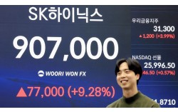 3일 서울 중구 우리은행 본점 딜링룸 전광판에 SK하이닉스 종가가 표시되고 있다. 이날 SK하이닉스 주가는 전 거래일 대비 77,000원(9.28%) 상승한 907,000원에 마감했다. 뉴스1 코스피가 연일 고공행진을 기록하는 와중에 SK하이닉스에 3억 …