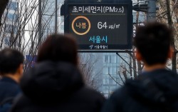 5일 서울 중구 시청역 인근 설치된 전광판에 초미세먼지 농도가 표시되고 있다. 뉴시스 국외 미세먼지에 황사까지 유입되면서 서울을 비롯한 전국 곳곳의 대기질이 최악 수준을 기록하고 있다. 6일에도 강추위와 함께 탁한 하늘이 이어질 전망이다. 한국환경공…