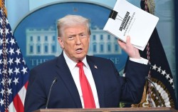 도널드 트럼프 미국 대통령이 취임 1주년인 20일(현지시간) 백악관 브리핑룸에서 ‘업적’이라고 적힌 종이 뭉치를 들고 1년간의 정책 성과를 소개하고 있다. 주요 사례로 한국·일본의 대미 투자를 제시하며 1300여㎞의 가스관을 신설하는 알래스카 천연가스 프로젝트도 언급했…