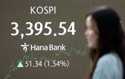 지난 12일 오후 서울 중구 하나은행 딜링룸 전광판에 코스피 지수 종가가 전 거래일 대비 51.34포인트(1.54%) 상승한 3,395.54로 마감하고 있다. 이날 코스피 지수는 개장하자마자 사상 최고치를 갈아치우며 장중 거듭 최고 기록을 경신하며 상승세를 이어갔다…