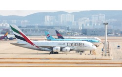 4일 인천국제공항에 에미레이트 항공 A-380 여객기가 계류하고 있다. 해당 여객기는 지난달 28일 오후 아랍에미리트(UAE) 두바이에서 인천공항에 도착해 1일 밤 승객을 태우고 두바이로 돌아갈 예정이었지만 중동 사태로 인해 항공편이 결항되며 인천공항에 계류하게 됐…