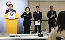 지난해 12월 세종시 정부세종청사 교육부 브리핑실에서 오승걸 전 한국교육과정평가원장(왼쪽)이 2026학년도 대학수학능력시험 채점 결과를 발표한 뒤 기자들의 질문에 답하고 있다. 오른쪽부터 권영락 대학수학능력시험본부장, 민경석 대학수학능력시험 채점위원장. 연합뉴스 …