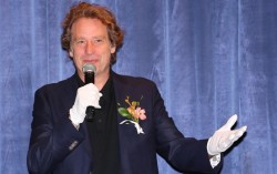 미국 팝아트 작가 조엘 메슬러가 1일 인천 중구 파라다이스시티 아트스페이스에서 열린 국내 첫 개인전 파라다이스 파운드(Paradise Found) 사전 공개 행사에서 작품 '파라다이스 위드 블로섬스(Paradise with Blossoms)'를 소개하고 있다. 연합뉴스…