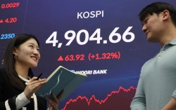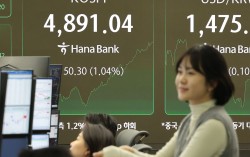 19일 서울 중구 하나은행 딜링룸 전광판에 코스피가 표시돼있다. 연합뉴스 코스피가 19일 장중 상승폭을 키우며 사상 처음으로 4900선을 넘어섰다. 이날 오후 1시 59분 현재 코스피는 전장보다 64.72포인트(1.34%) 오른 4905.46을 기록…