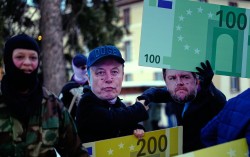 18일(현지시간) 스위스 다보스에서 일론 머스크 테슬라 최고경영자(가운데)와 JD밴스 미국 부통령(오른쪽)의 가면을 쓴 사람들이 이곳에서 열리는 세계경제포럼(WEF) 연례 총회 반대 시위를 하고 있다. AP=연합뉴스 지난해 자산 10억 달러(약 1조500…