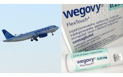 지난해 11월 7일(현지시간) 미국 일리노이주 시카고 오헤어 국제공항에서 유나이티드 항공 여객기가 이륙하고 있는 모습. 오른쪽 사진은 비만치료제 ‘위고비’. AFP=연합뉴스 위고비·마운자로 등 비만 치료제 확산으로 승객들의 평균 체중이 줄어드는 데 따라 미국 항…