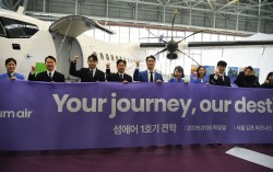 15일 서울 김포국제공항 격납고에서 열린 섬에어 1호기 도입식에서 최용덕 대표(왼쪽에서 다섯번째)가 직원들과 기념사진을 촬용하고 있다. 사진 섬에어 15일 오전 10시, 서울 강서구에 위치한 김포국제공항 격납고 문이 열리자 신생 항공사 ‘섬에어(sum …