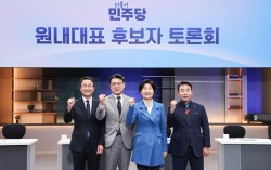 더불어민주당 원내대표 보궐선거에 출마한 한병도(왼쪽부터)·진성준·백혜련·박정 후보가 8일 서울 마포구 상암동 JTBC에서 열린 원내대표 후보자 토론회 시작에 앞서 기념 촬영하고 있다. 연합뉴스 더불어민주당 원내대표 보궐선거 후보자들은 8일 김병기 전 원내…