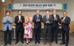 김창범 한경협 부회장을 비롯한 내빈들이 9일 FKI타워에서 열린 '한미 원자력 에너지 협력 포럼'에 참석해 기념촬영을 하고 있다. 사진 앞줄 왼쪽부터 정용훈 카이스트 교수, 로버트 패라리 아폴로 상무, 브리짓 포쉬 아폴로 APAC크레딧총괄, 김창범 한경협 부회장, 마이…