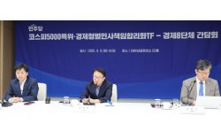 권칠승 더불어민주당 코스피5000특별위원회 경제형벌민사책임합리화TF 단장이 9일 서울 상의의환에서 열린 경제8단체 간담회에서 인사말을 하고 있다. 사진 대한상의 재계가 여당인 더불어민주당이 추진하는 경제입법에 ‘속도 조절’이 필요하다고 호소했다. 하지만 …