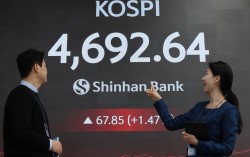 13일 서울 중구 신한은행 본점에 코스피 지수가 표시되고 있다. 이날 코스피 지수는 전장보다 67.85포인트(1.47%) 오른 4,692.64에 장을 끝냈다. 연합뉴스 코스피가 13일 사상 최고치를 갈아치우며 4700선 턱밑까지 차올랐다. 연초부터 지수를…