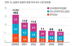 국내 완성차 시장에서 한국GM·KG모빌리티·르노코리아 등 중견3사 점유율이 역대 가장 낮은 수준까지 떨어졌다. 현대차·기아는 물론 테슬라 등 수입차에도 밀리면서다. 13일 한국자동차모빌리티산업협회(KAMA)에 따르면 지난해 국산차 중견3사의 국내 시장 점유율은 6…