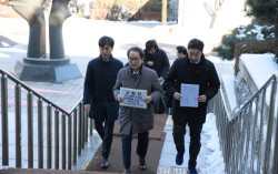 국회 정무위원회 범여권 위원들이 2일 김병주 MBK파트너스 회장 등 7명을 국회증언감정법 위반 혐의로 고발하기 위해 대검찰청 종합민원실로 향하고 있다. 왼쪽부터 한창민 사회민주당 의원, 강준현 더불어민주당 간사, 이강일 민주당 의원. 사진 김용만 민주당 의원실 …