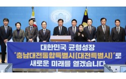 더불어민주당 황명선 대전통합 및 충청지역 발전 특위 상임위원장 등 대전,충남지역 의원들이 2일 국회 소통관에서 기자회견을 열고 현안과 관련한 발언을 하고 있다. 연합뉴스 더불어민주당이 충남과 대전을 통합해 경제·과학·국방 중심의 초광역 도시를 조성하는 내용을 담은…