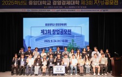 중앙대 경영경제대학 창업공모전 사진. 공모전 참가자들이 기념촬영을 하고 있다. 중앙대학교(총장 박상규)가 역대 최대 규모의 재학생 창업공모전을 개최했다. 중앙대는 24일 경영경제대학(학장 김창봉) 주관으로 310관(100주년 기념관) 대신홀에서 ‘2…