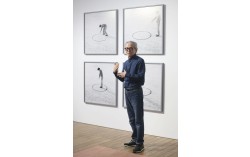 4일 서울 페이스갤러리에서 퍼포먼스 ‘장소의 논리’(뒤 사진)를 재연하는 이건용. [연합뉴스] 전시장에 놓인 나무판에 백묵으로 원을 그렸다. 원 밖에 서서 원 안을 가리키며 “저기, 저기, 저기”라고 외쳤다. 원 안으로 들어가 바닥을 가리키며 “여기, 여…