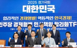 김병기 더불어민주당 원내대표, 권칠승 TF단장이 2일 서울 여의도 국회에서 열린 경제형벌민사책임합리화TF 발대식에서 기념촬영하고 있다. 뉴스1 정부가 고의·중과실이 없는 경우 경제형벌을 완화하겠다고 밝힌 가운데, 경제계가 “경제 문제는 형벌보다 과태료·과…