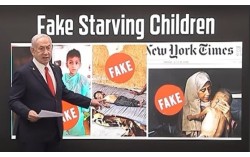 10일(현지시간) 기자회견에서 뉴욕타임스가 지난달 25일 신문 1면에 게재한 ‘뼈만 앙상한 18개월 아기 모하메드 알무타와크’ 사진에 '가짜'라는 빨간 딱지를 붙여 제시하는 베냐민 네타냐후 이스라엘 총리. 이스라엘 총리실 유튜브 캡처 베냐민 네타냐후 이스라엘 총리…