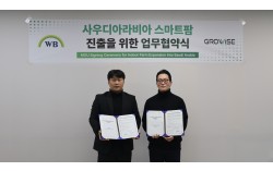 ㈜그로와이즈 윤영범 대표이사(왼쪽)와 월드브리지산업(주) 및 ㈜월드브리지 알 사우디 탁원준 대표이사(오른쪽). 중동 지역의 농업 패러다임이 생산성 중심의 첨단 기술 도입으로 빠르게 전환되는 흐름 속에, 한국의 스마트팜 스타트업 그로와이즈(Growise·대…