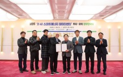 주광덕 남양주시장(오른쪽)과 김용호 남양주마석아이디씨 유한회사 대표이사(왼쪽)가 28일 남양주시 화도읍에 1조원 규모의 데이터센터를 건립하는 내용의 협약서에 서명한 후 기념촬영을 했다. 사진 남양주시 남양주시가 ‘산업생태계 대전환’을 선포한 지 1년 만에 누적 투…
