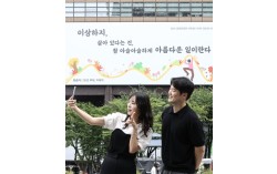 1일 서울 종로구 교보생명 광화문글판이 가을을 맞아 새 옷을 입었다. 글귀는 최승자 시인의 시 ‘20년 후에, 지(芝)에게’에서 따왔고, 배경은 ‘2025 광화문글판 대학생 디자인 공모전’ 대상 수상작인 한국교원대 조혜준씨의 작품이다.