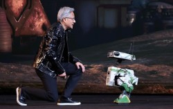 젠슨 황 엔비디아 CEO가 5일(현지시간) 미국 네바다주 라스베이거스 퐁텐블로 호텔에서 열린 엔비디아 CES 2026 라이브에서 소형 컴퓨터 '젯슨'(Jetson)을 탑재한 소형 로봇을 바라보고 있다. 뉴스1 젠슨 황 엔비디아 최고경영자(CEO)는 5일(현지시간)…