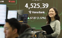 6일 서울 중구 하나은행 딜링룸에서 딜러들이 대화하고 있다. 이날 코스피는 전장보다 67.96포인트(1.52%) 오른 4525.48에 거래를 마감했다. 연합뉴스 코스피가 사흘째 오르며 6일 사상 처음 4500선을 돌파했다. 이날 코스피는 전장보다 67.96포…