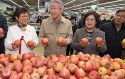 강호동 농협중앙회장이 지난 1월 26일 농협하나로마트 양재점에서 열린 설 물가안정 프로젝트 ‘농심!천심!동심! 특별할인 행사’에서 사과를 살펴보고 있다. 농협중앙회 사과는 껍질째 먹는 것이 영양 면에서 더 이롭지만, 국민 10명 중 6명은 농약 잔류를 우려해 껍질…