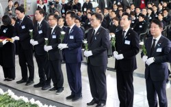 29일 오전 전남 무안국제공항에서 열린 12ㆍ29 제주항공 여객기 참사 1주기 추모식에서 우원식 국회의장(오른쪽 세 번째)과 정청래 더불어민주당 대표, 장동혁 국민의힘 대표 등 국회 대표가 헌화하고 있다. 연합뉴스 무안공항 제주항공 여객기 참사 1주기를 맞은 29…