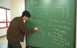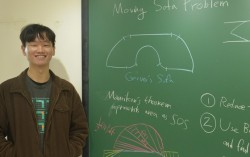 백진언 고등과학원 허준이수학난제연구소 박사가 60년 가까이 풀리지 않던 수학 난제인 ‘소파 움직이기 문제’를 해결하고 이에 대해 칠판에 필기하며 설명하고 있다. [사진 고등과학원] 60년 가까이 풀리지 않던 수학 난제 ‘소파 움직이기 문제’를 푼 30대 …