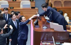 정청래 더불어민주당 대표가 지난달 24일 국회에서 열린 12월 임시국회 본회의에서 전날 상정된 정보통신망법 개정안에 대한 무제한 토론(필리버스터) 종결을 위한 투표를 마친 뒤 우원식 국회의장과 악수하고 있다. 연합뉴스 미국 국무부가 더불어민주당 주도로 국…