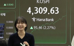 2026년 첫 거래일인 2일 서울 중구 하나은행 딜링룸에서 한 딜러가 활짝 웃고 있다. 연합뉴스 코스피가 새해 첫 거래일인 2일 처음으로 4300선 고지를 넘어섰다. 수출 호조 속에 외국인 자금이 유입된 데다 반도체 ‘투톱’인 삼성전자와 SK하이닉스가 나…