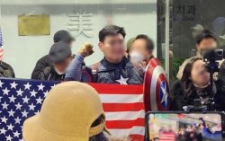 지난 2월 10일 서울 중구 국가인권위원회에서 열린 '2025년 제2차 전윈위원회'를 앞두고 마블 캐릭터 '캡틴 아메리카' 복장을 한 윤석열 대통령 지지자가 시위하고 있다. 연합뉴스 영화 마블의 캐릭터 ‘캡틴 아메리카’ 복장으로 주한 중국대사관 난입을 시…