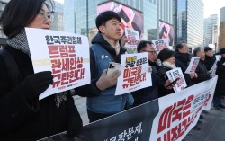 27일 서울 광화문광장에서 트럼프위협저지공동행동 관계자들이 '미국의 쿠팡 사태 압박 규탄 기자회견'을 하고 있다. 연합뉴스 개인정보 유출과 불공정 거래 등 각종 불법 의혹에 휩싸인 쿠팡이 미국 정부와 의회를 상대로 로비를 벌여왔다는 사실이 알려지면서 소상…