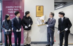 27일 서울 성북구 고려대 한투스퀘어 학생식당 앞에서 고 이영철씨 기념패 제막식이 열렸다. (왼쪽부터) 박현숙 학생처장, 교우 설동연씨, 고 이영철씨 아들 이진호씨, 김동원 총장, 왕민우 총학생회 중앙비상대책위원회 위원장. 사진 고려대 고려대가 25년간 …