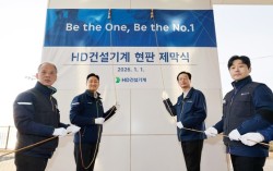 1일 울산캠퍼스에서 진행된 HD건설기계 현판 제막식에서 주요 관계자들이 기념 촬영을 하고 있다. 왼쪽부터 임영모 HD건설기계 지회장, 정기선 HD현대 회장, 문재영 HD건설기계 사장, 안재선 인천노조 위원장. 사진 HD현대 국내 시장점유율 1·2위 건설기…