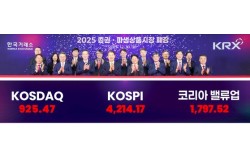 올해 마지막 거래일인 30일 정은보 한국거래소 이사장(정가운데)이 임원들과 함께 한국거래소 부산 본사에서 '2025년 증권·파생상품시장 폐장식'을 개최하고, 종가 지수를 바탕으로 단체 기념촬영을 하고 있다. 사진 한국거래소 제공 비상계엄과 탄핵 국면 속에…
