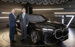 이재용 삼성전자 회장이 2022년 12월 17일 인천 영종도에 위치한 BMW 드라이빙 센터에서 올리버 집세 BMW 최고경영자(CEO) 등과 만나 삼성SDI의 최첨단 'P5' 배터리셀이 적용된 BMW의 최신 전기차 '뉴 i7' 등을 살펴본 뒤 기념 촬영하고 있다. 연합뉴…