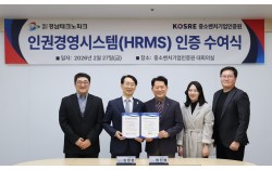 엄진엽 중소벤처기업인증원 원장(오른쪽 세 번째)과 김정환 경남테크노파크 원장(오른쪽 네 번째)이 관계자들과 함께 인권경영시스템 인증서 수여식 후 기념촬영을 하고 있다. 중소벤처기업인증원(원장 엄진엽, KOSRE)은 (재)경남테크노파크(원장 김정환, 이하 …