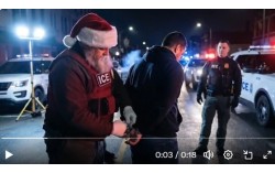 크리스마스 시즌을 맞아 미국 국토안보부 산하 이민세관단속국(ICE)이 지난 22일(현지시간) 소셜미디어 엑스(X)를 통해 공개한 인공지능(AI) 영상 한 장면. 산타클로스 복장을 한 법 집행 요원이 불법 이민자에 수갑을 채워 체포하는 모습이 담겼다. 사진 미 ICE 엑…