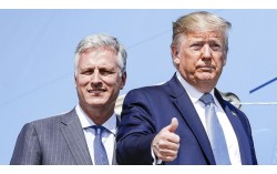 도널드 트럼프 미국 대통령(오른쪽)이 집권 1기 때인 2019년 9월 18일(현지시간) 로버트 오브라이언 신임 백악관 국가안보보좌관과 함께 로스앤젤레스 국제공항에서 대통령 전용기(에어포스 원)에 오르며 ‘엄지 척’ 인사를 하고 있다. AP=연합뉴스 미국 …