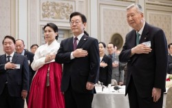 이재명 대통령이 22일 청와대 영빈관에서 열린 대한노인회 초청 오찬에 앞서 국민의례를 하고 있다. 오른쪽은 이중근 대한노인회 회장. 전민규 기자 이재명 대통령이 22일 “의료나 돌봄과 같은 기본적 복지는 더욱 촘촘하게 하되 어르신들의 경험과 지혜를 사회…