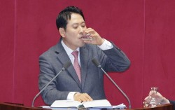 장동혁 국민의힘 대표가 22일 서울 여의도 국회에서 열린 제430회국회(임시회) 제2차 본회의에서 '12·3 윤석열 비상계엄 등에 대한 전담재판부 설치 및 제보자 보호 등에 관한 특별법안(대안)에 대한 수정안'에 대한 무제한 토론(필리버스터)을 하며 목을 축이고 있다.…