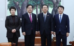 김병기 더불어민주당 원내대표와 송언석 국민의힘 원내대표가 22일 오후 국회에서 회동을 하고 있다. 오른쪽부터 더불어민주당 문지석 원내수석부대표, 김 원내대표, 국민의힘 송 원내대표, 김은혜 원내정책수석부대표. 임현동 기자 팽팽하던 여야 간 특검 대치가 22일 새 …