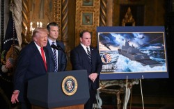 도널드 트럼프 미국 대통령이 피트 헤그세스 국방장관, 존 펠런 해군장관(왼쪽부터)과 함께 22일(현지시간) 플로리다주 마러라고에서 ‘황금 함대’ 구축 계획을 발표하고 있다. [AFP=연합뉴스] 미국이 냉전 이후 역사에서 퇴장한 ‘전함(Battleship)…