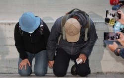 대만 타이베이 지하철 흉기 난동 사건의 용의자 부모가 23일 타이베이시 법의검시부검센터에서 취재진 앞에 무릎을 꿇고 사과하고 있다. AFP=연합뉴스 대만 타이베이 도심에서 발생한 흉기 난동 사건 용의자의 부모가 무릎을 꿇고 아들의 범행에 대해 사죄했다. 23…
