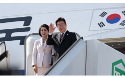이재명 대통령과 김혜경 여사가 1박2일 방일 일정을 마치고 24일 오후 도쿄 하네다공항에서 미국 워싱턴으로 향하는 공군1호기에 올라 인사하고 있다. 2025.08.24. 대통령실사진기자단 한·미 정상회담이 하루 앞으로 다가왔다. 경제·산업 분야에서 주목…