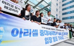 공장 화재로 23명의 사망자를 낸 사고와 관련해 중대재해처벌법으로 기소된 일차전지 업체 아리셀 박순관 대표의 1심 선고가 내려진 23일 경기도 수원시 영통구 수원지방법원에서 유가족 및 시민단체 회원들이 기자회견을 하고 있다. 연합뉴스 “중대재해처벌법 시행…