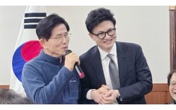 지난 17일 저녁 국민의힘 수도권 전·현직 당협위원장 모임인 ‘이오회’에 참석한 김문수 전 고용노동부 장관과 한동훈 전 대표(왼쪽부터)가 러브샷을 하고 있다. [사진 유튜브 캡처] 한동훈 전 국민의힘 대표의 ‘당원 게시판 의혹’을 둘러싸고 보수 진영이 서…