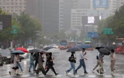 17일 서울 종로구 광화문네거리에서 우산을 쓴 시민들이 발걸음을 옮기고 있다. 뉴스1 이번 주 중반부터 주말까지 전국 곳곳에 비가 이어질 전망이다. 일부 지역은 시간당 50㎜의 강한 비와 함께 최대 100㎜ 이상 누적 강수량이 쏟아질 수 있어 피해 대비가…